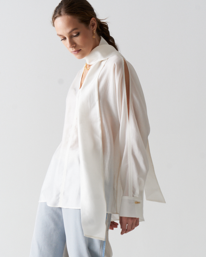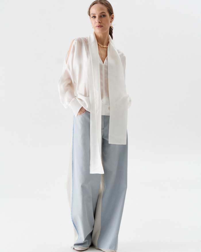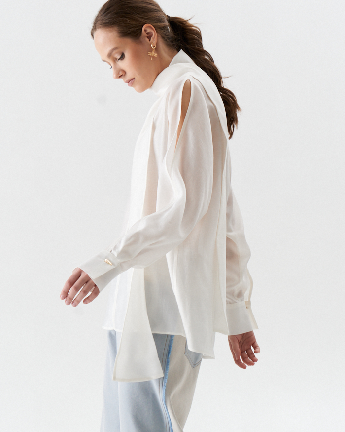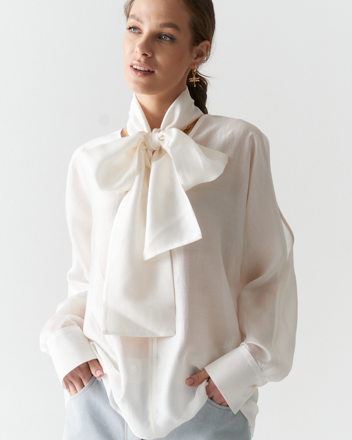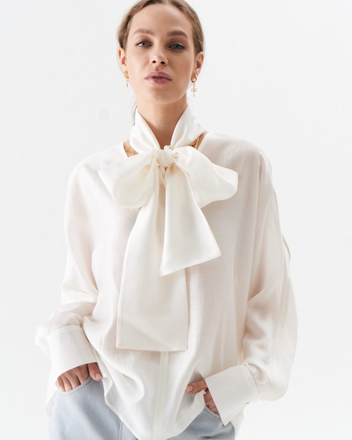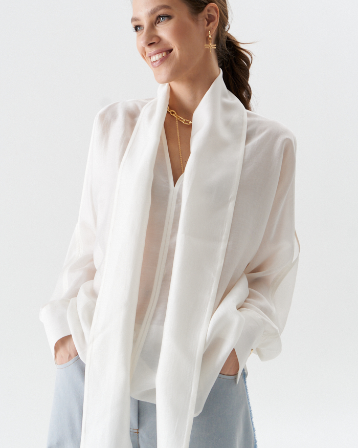 Блузка женская свободного силуэта с целькроенным рукавом. Манжета по низу рукава застегивается на петлю и пуговицу. Без воротника. Щель в верхнем шве рукава в области плеча. Декоративный шарф-пояс крепится к изделию по горловине спинки с помощью петли и пуговицы. Длина изделия по спинке - в размерах 42-50 - 70,0 см, в размерах 52-58 - 76,0 см.