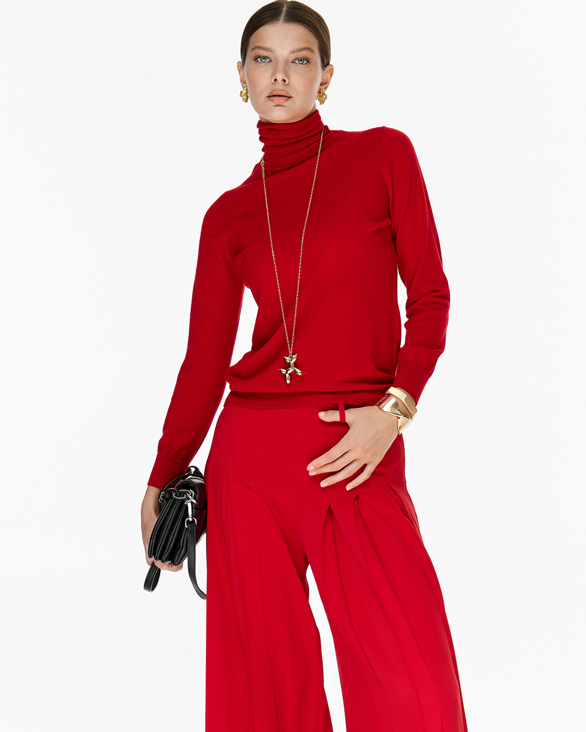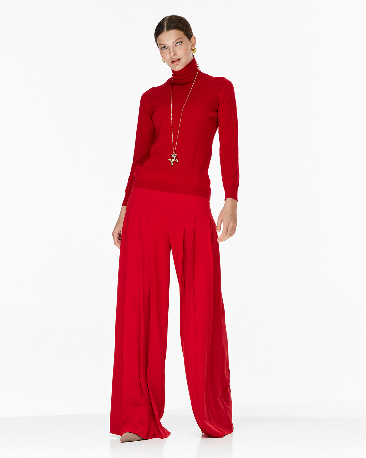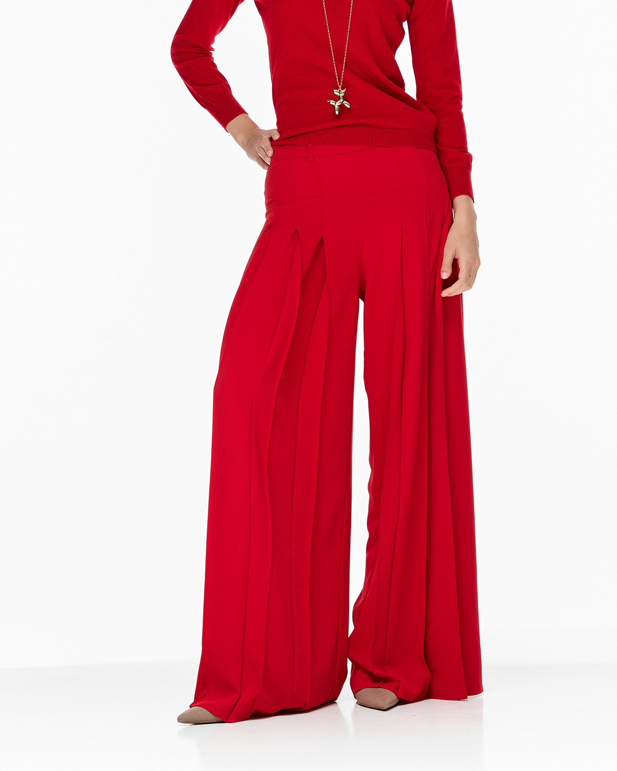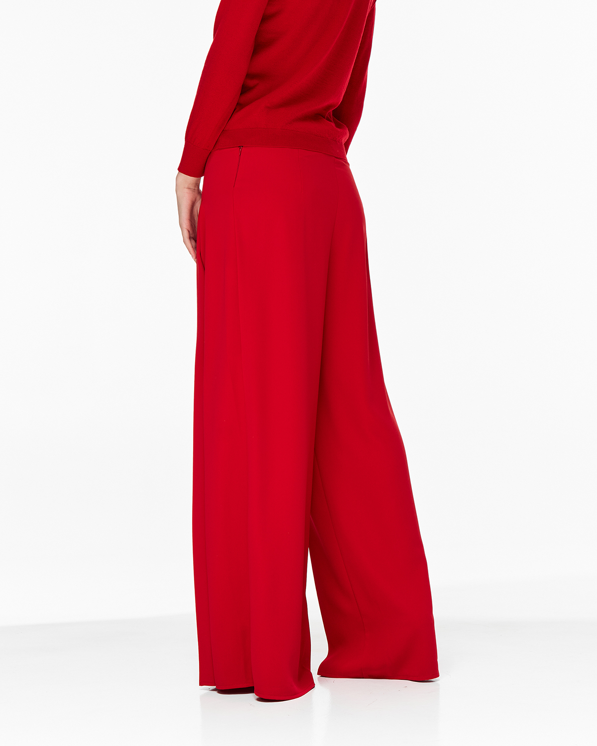 Брюки женские свободного кроя из струящегося матового материала. Передние детали с застроченными складками. Притачной пояс, застежка на потайную молнию и пуговицу сбоку.