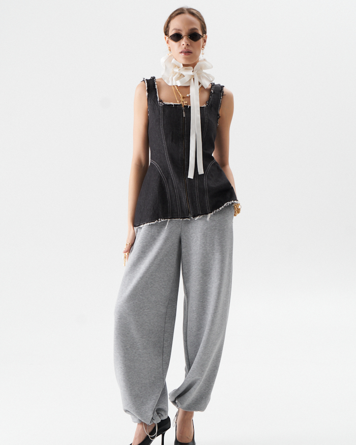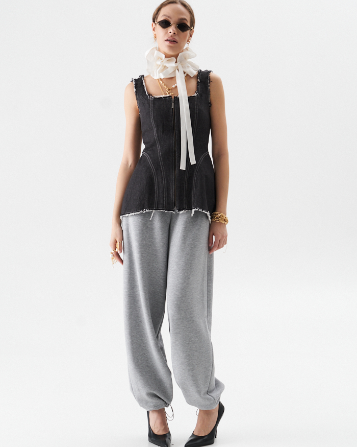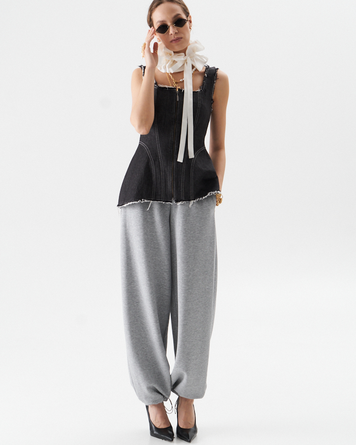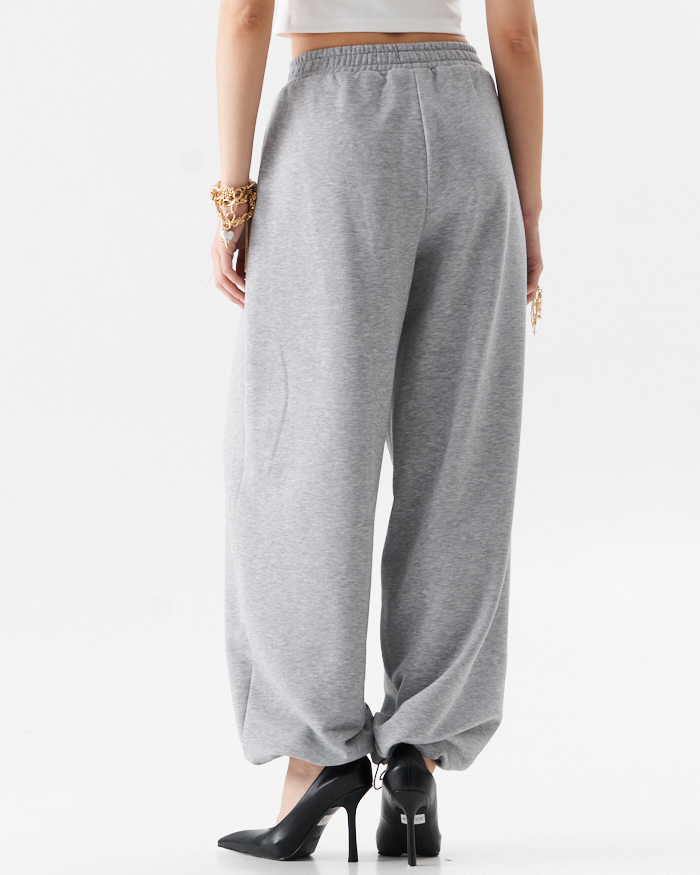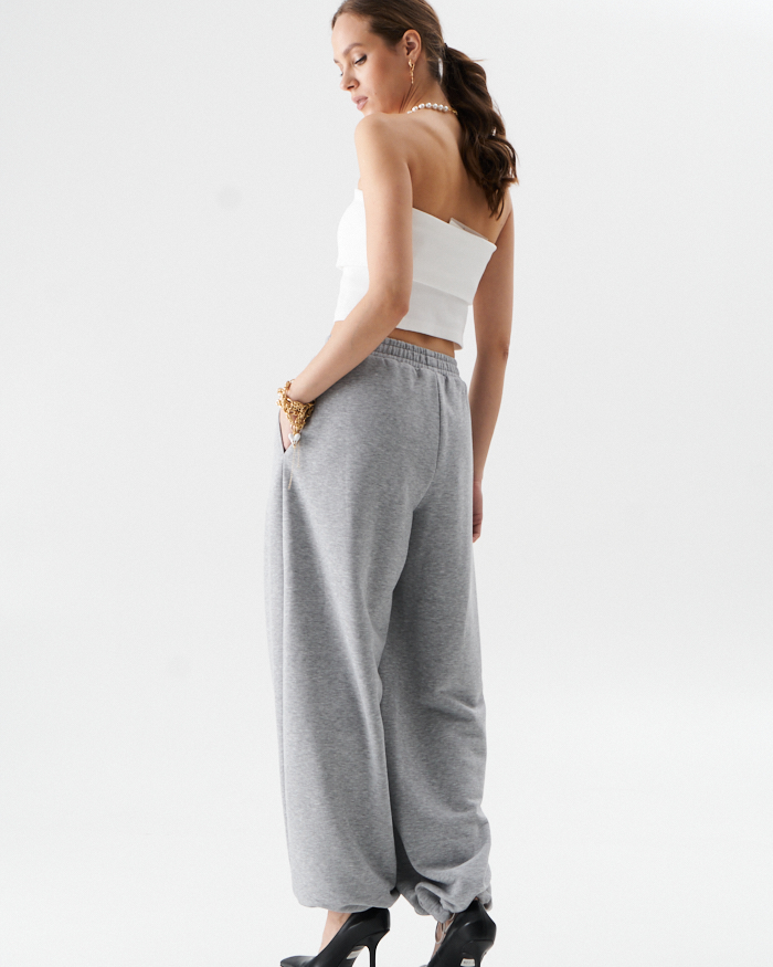 Брюки из трикотажного полотна в стиле спорт-шик .Брюки на отрезном поясе с эластичной тесьмой по кругу.Резинка фиксируется двумя строчками ,которые не дают возможность перекручиваться в процессе носки.По низу кулиса на эластичном шнуре с фиксаторами,что позволяет расширенный силуэт изделия перевоплатить в брюки ,, аладины,,.В боковых швах расположены карманы.Длина брюк с поясом 106-107 см