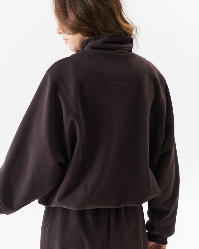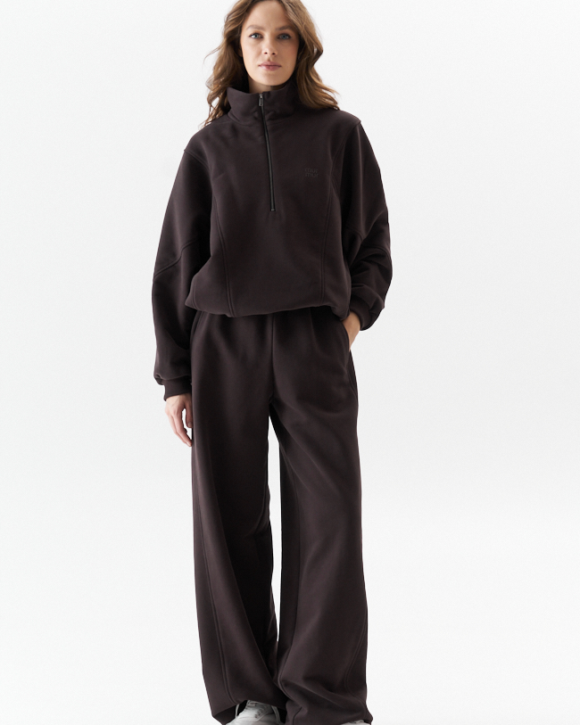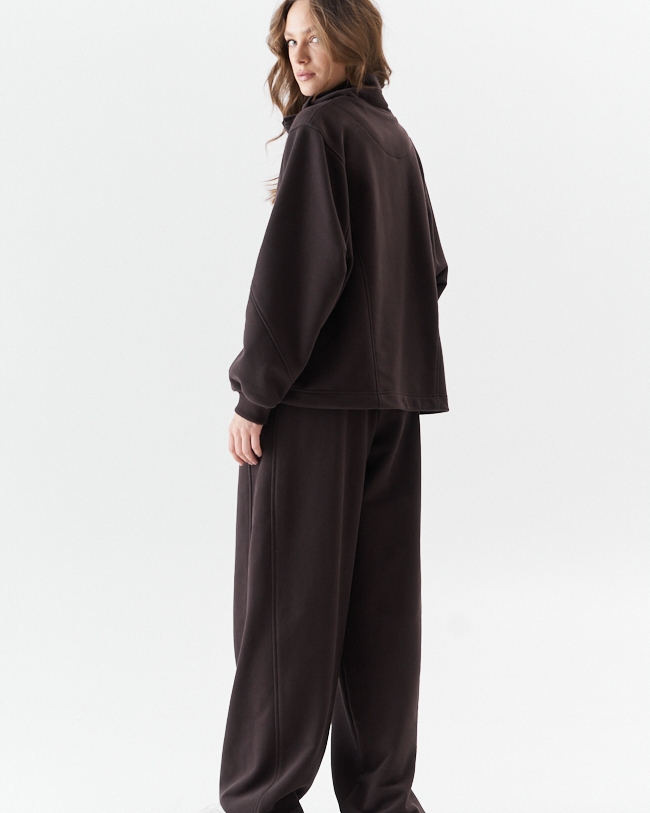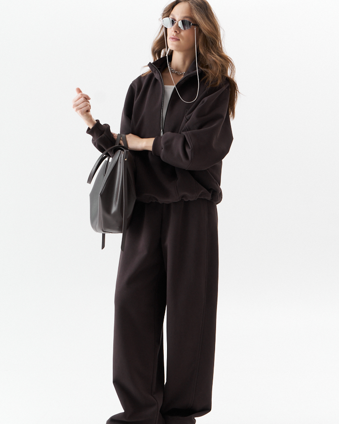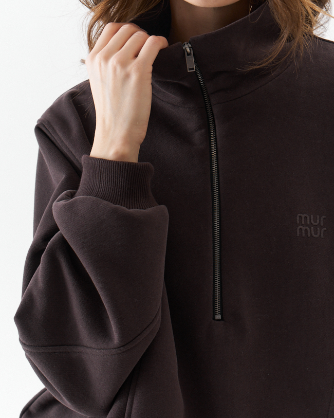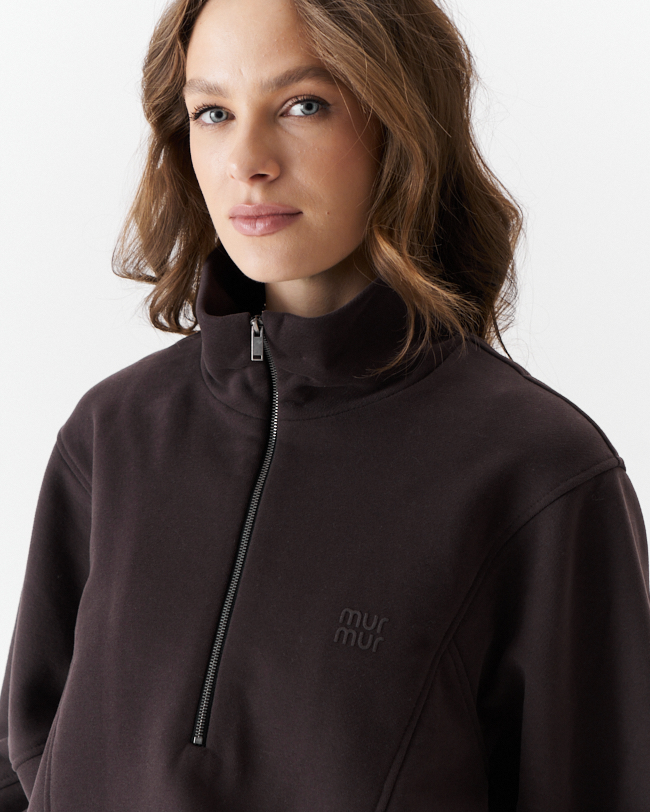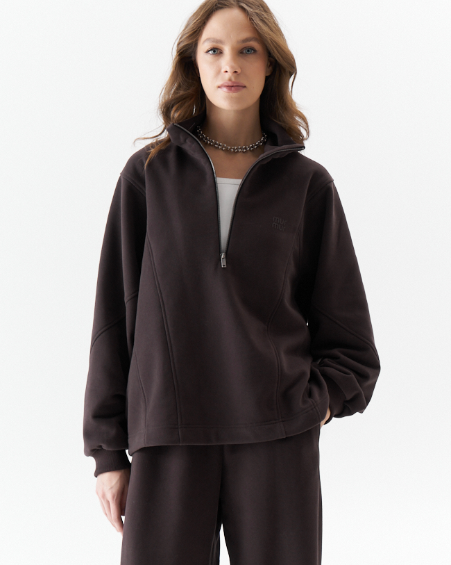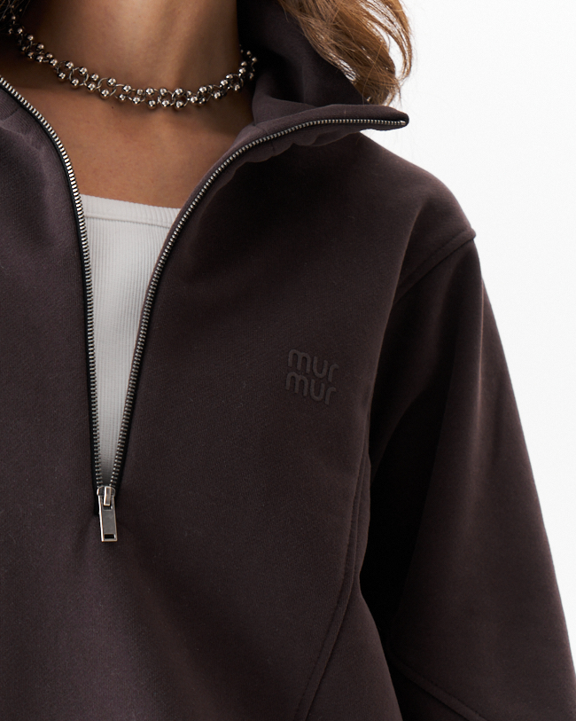 Джемпер женский из плотного трикотажа .Средний овер силуэт с красивыми рельефными сечениями,что придает изделю свою индивидуальность.Рукав рубашечный с хорошо углубленной проймой на манжете из кашкорсе.По переду металлическая молния, переходящая в горловину высокой стойки и печать с логотипом MURMUR.По низу кулиска с фиксаторами по бокомым швам,которыми можно регулировать ширину и длину низа и силуэт .Комплектуется с брюками М 14118