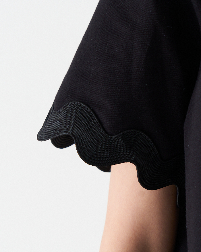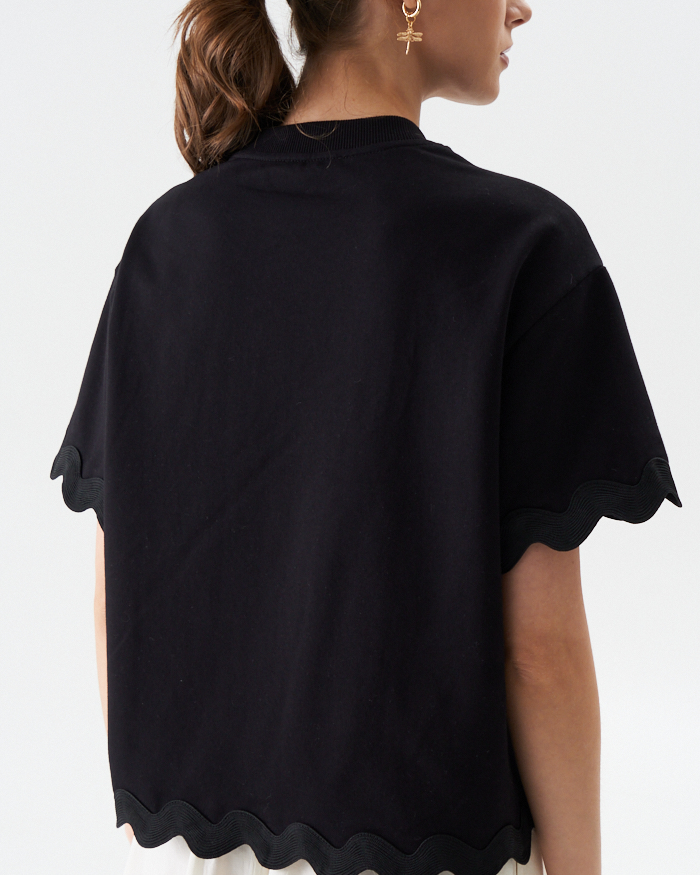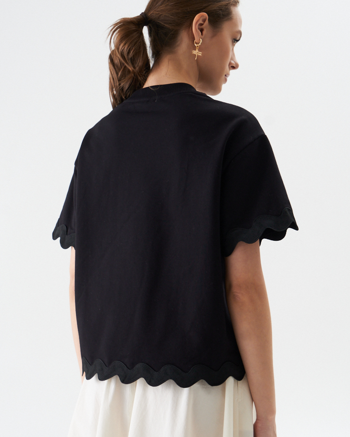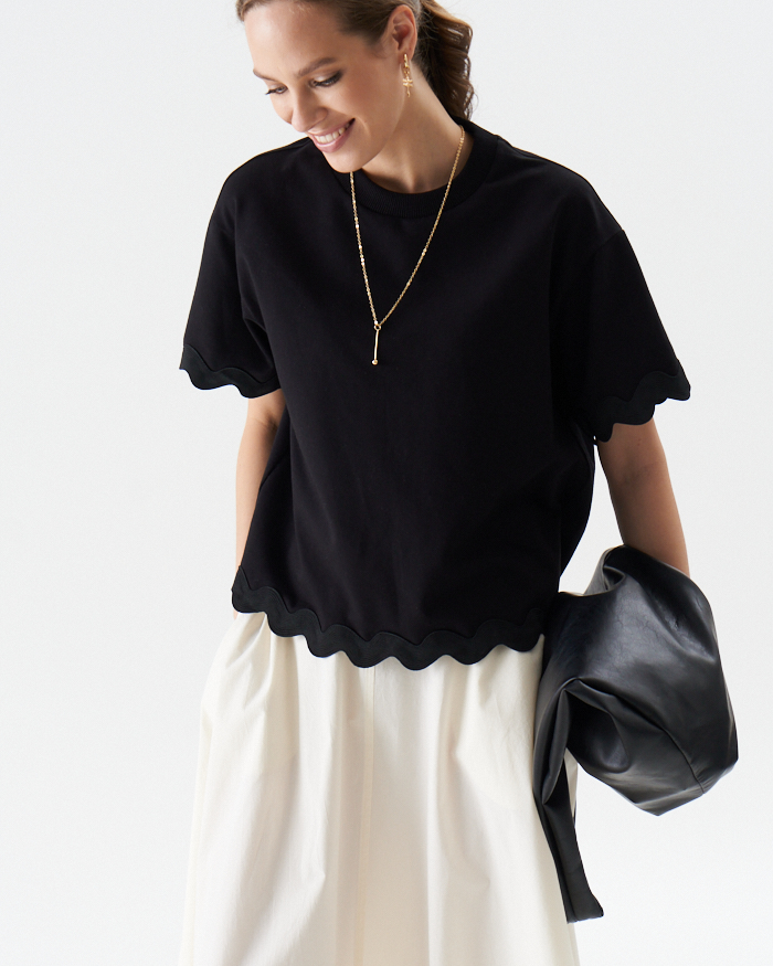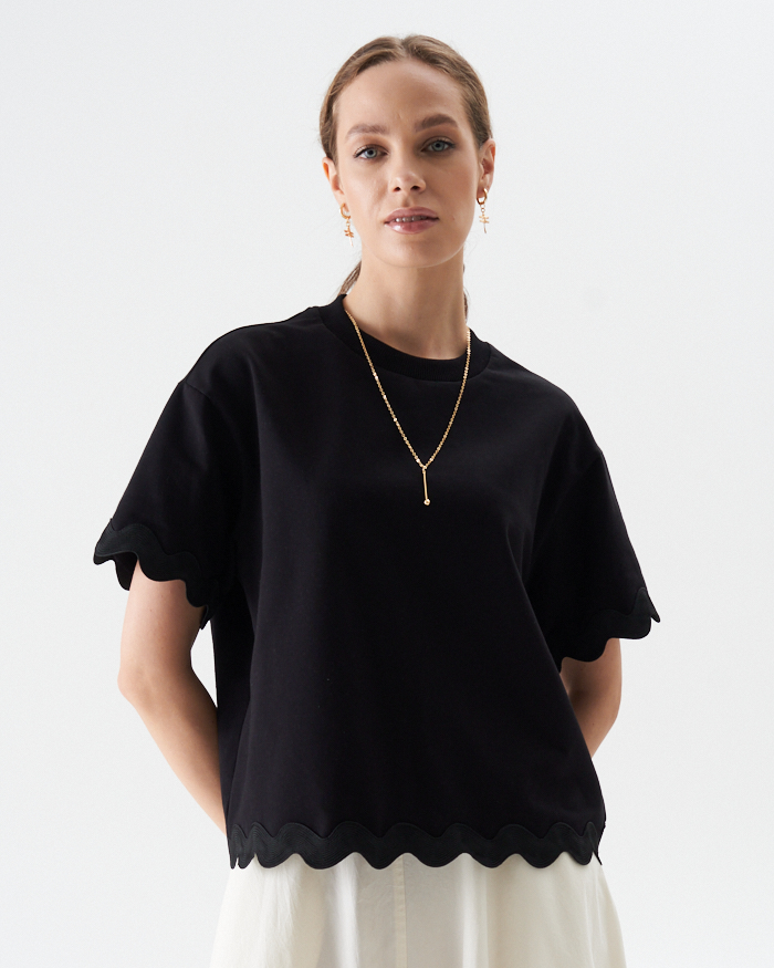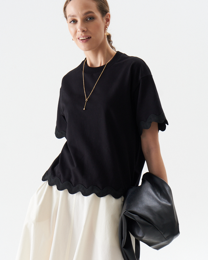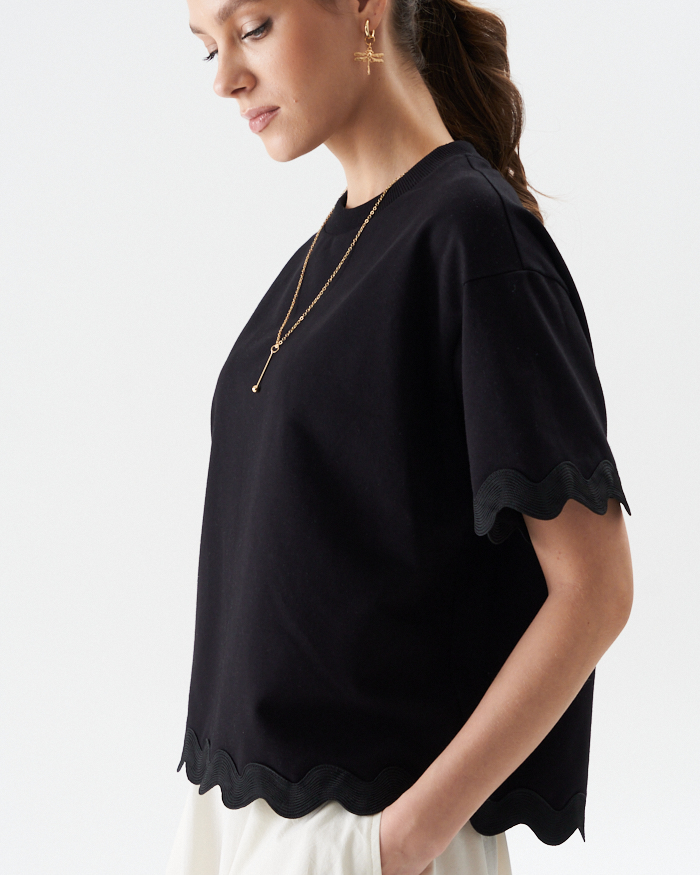 Джемпер женский из хлопкового трикотажа,прямого свободного силуэта. Рукав рубашечного типа. Горловина обработана деталью из кашкорсе. По низу изделия и рукава притачивается декоративная тесьма. Длина изделия по спинке - 57,0 см (в размерах 40-50), 62,0 см (в размерах 52-58).