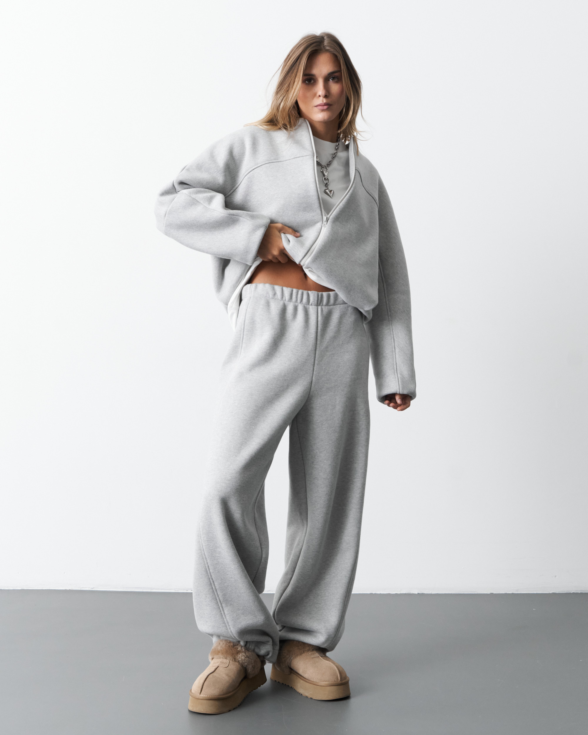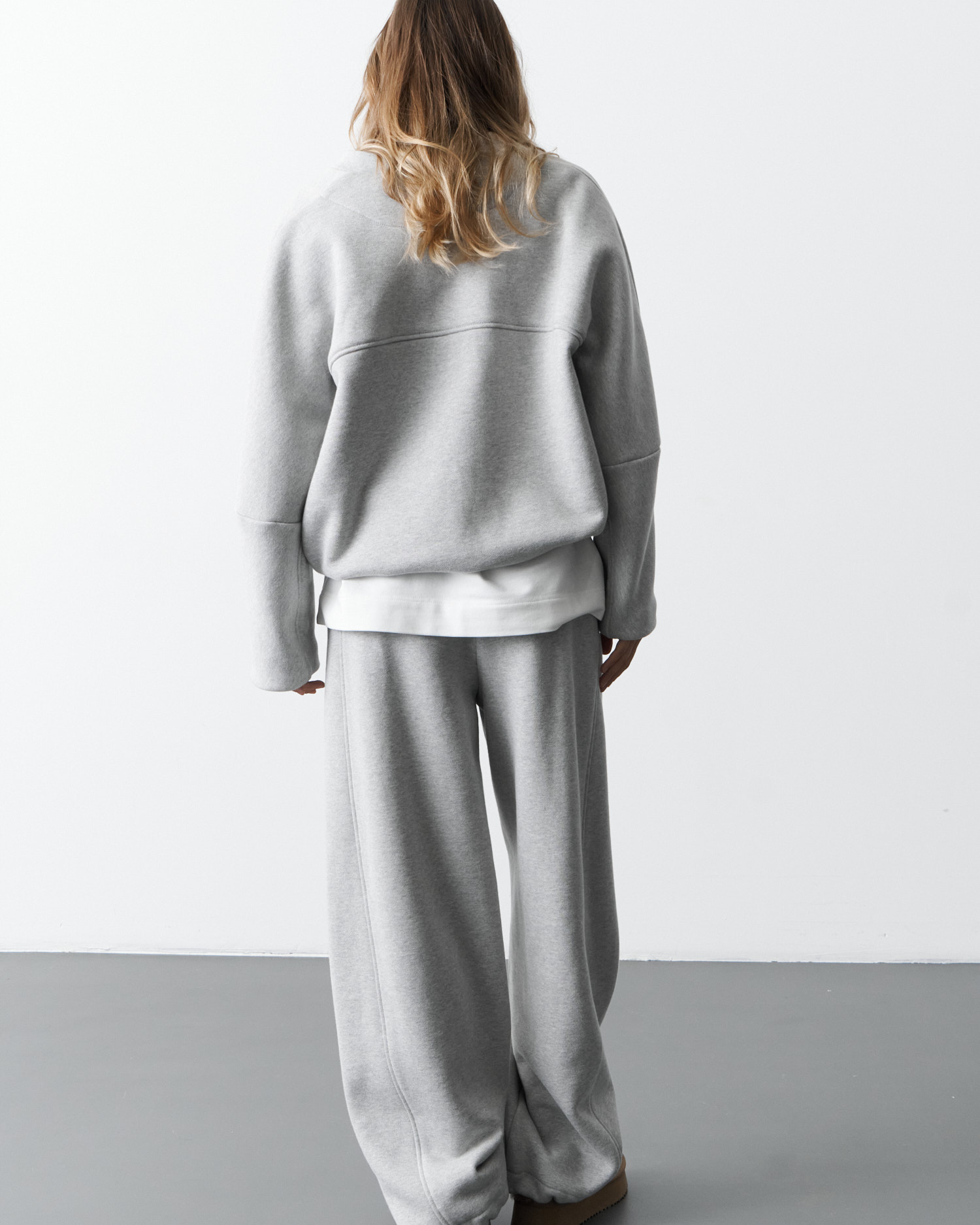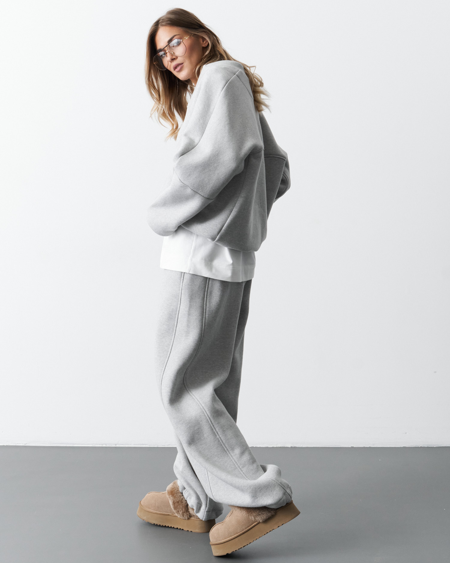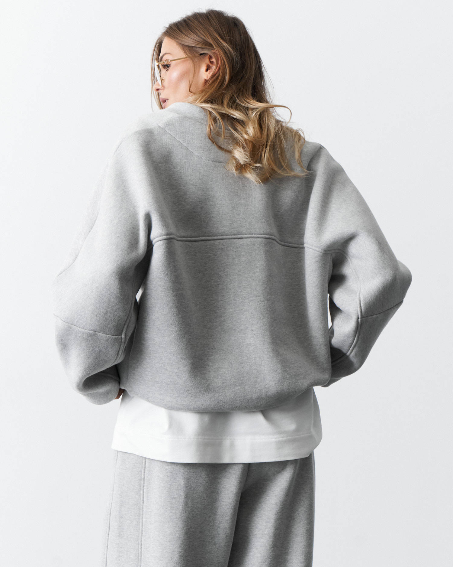 Спортивный костюм (брюки и джемпер) из футера с начесом. Джемпер свободного кроя,застежка - на тесьму-молнию,боковые карманы в шве. Манжеты и пояс - из кашкорсе.Брюки прямого кроя,пояс на широкой резинке,карманы в шве.Низ джемпера и низ брюк стягивается с помощью эластичного шнура.Воротник - стойка.Длина джемпера - 65,0 см, длина брюк - 113,0 см.