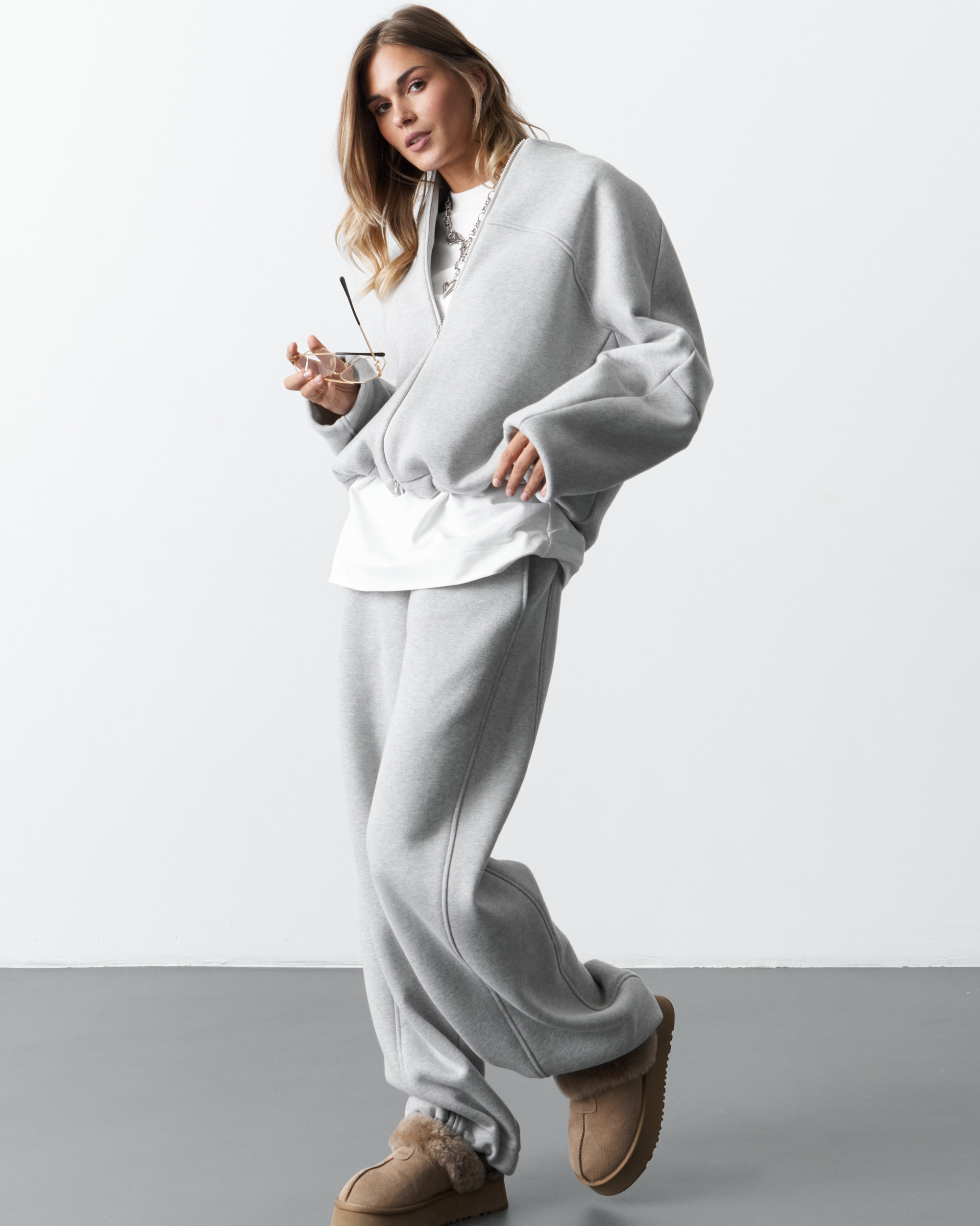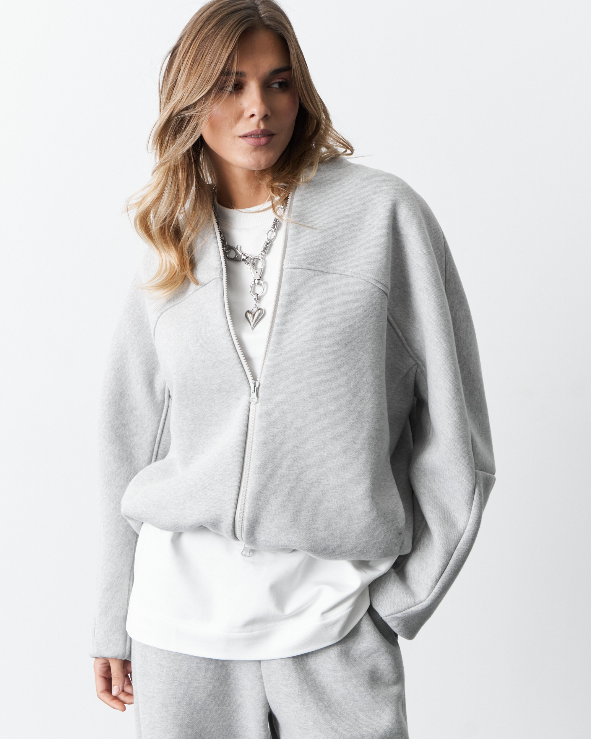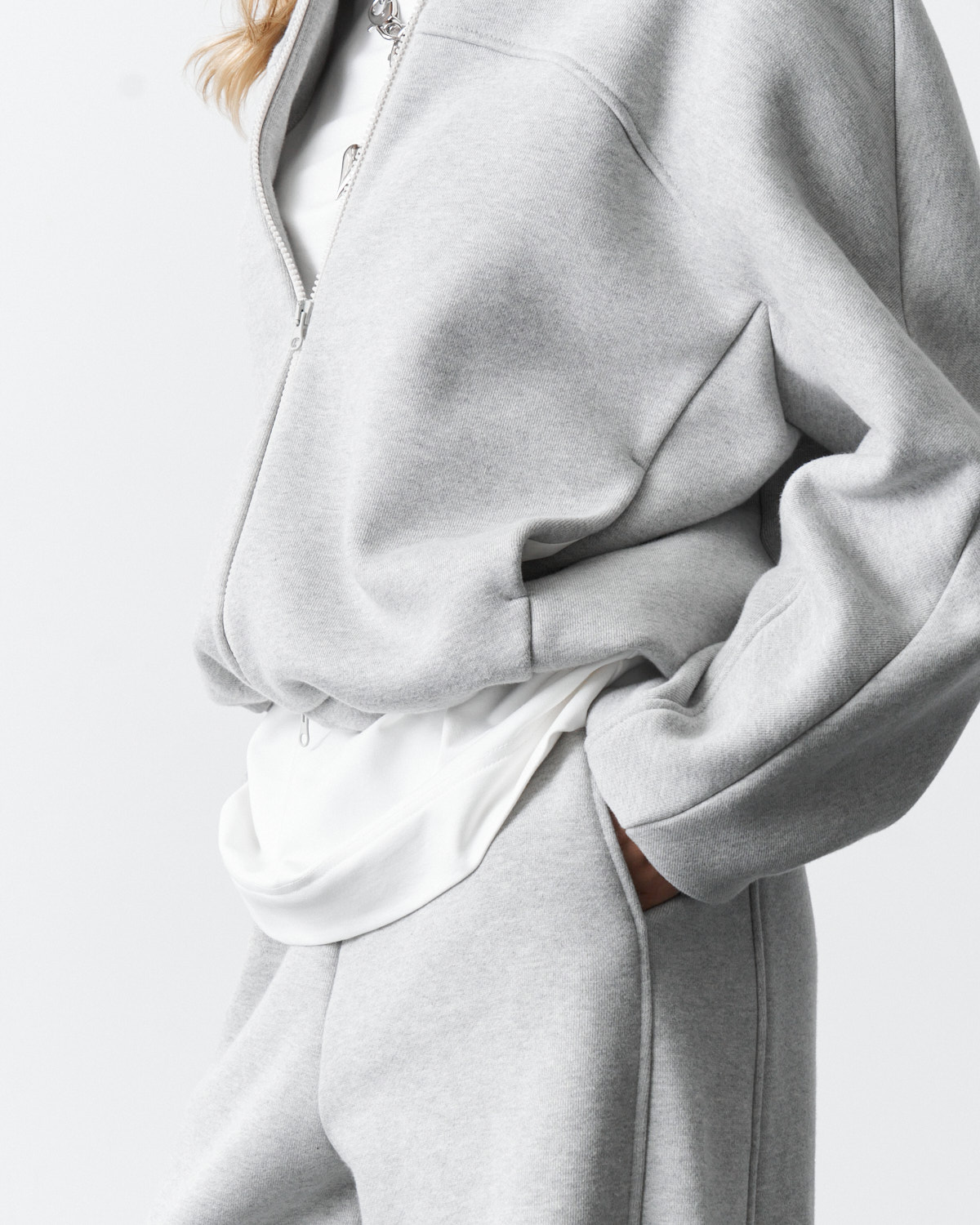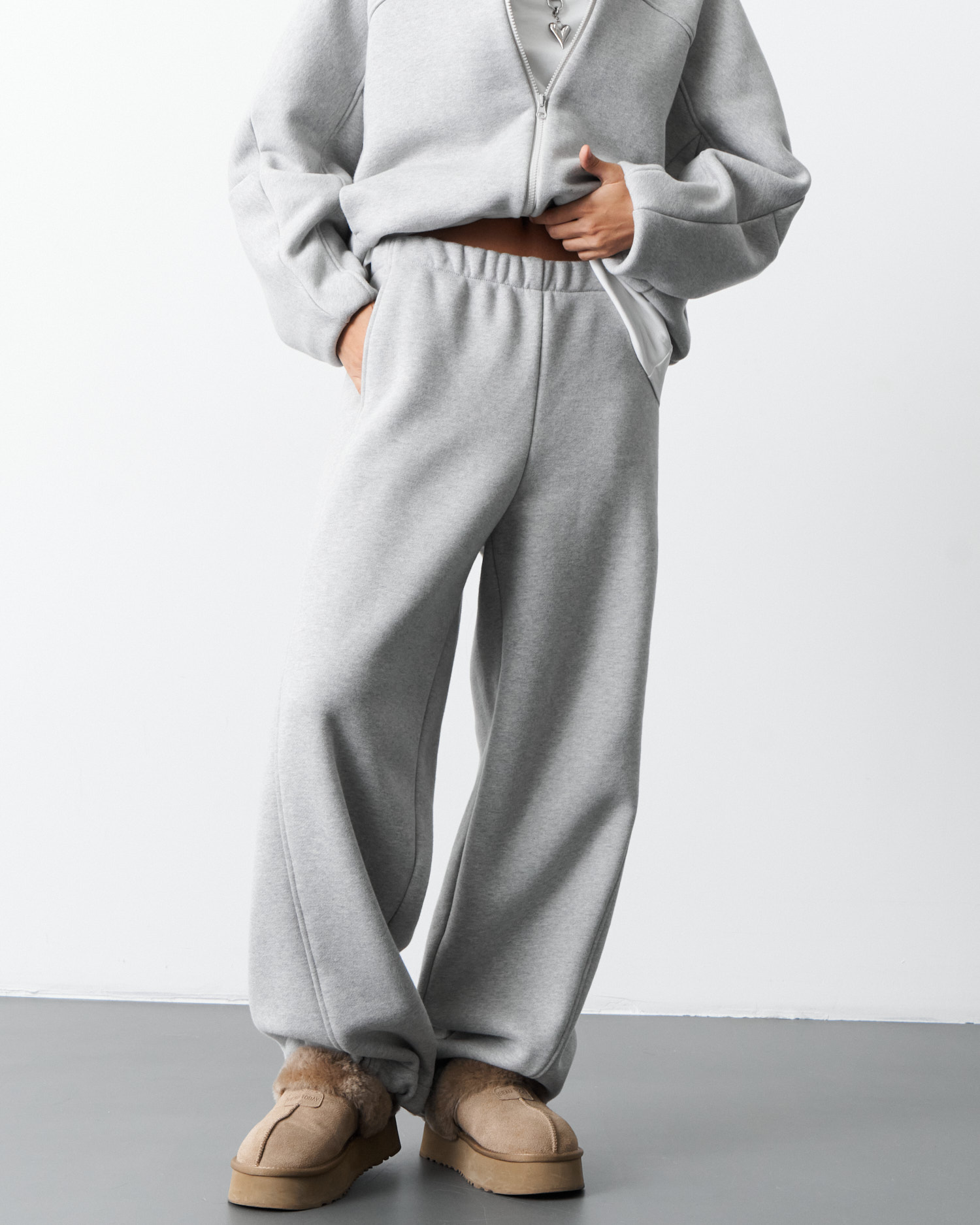 Спортивный костюм (брюки и джемпер) из футера с начесом. Джемпер свободного кроя,застежка - на тесьму-молнию,боковые карманы в шве. Манжеты и пояс - из кашкорсе.Брюки прямого кроя,пояс на широкой резинке,карманы в шве.Низ джемпера и низ брюк стягивается с помощью эластичного шнура.Воротник - стойка.Длина джемпера - 65,0 см, длина брюк - 113,0 см.