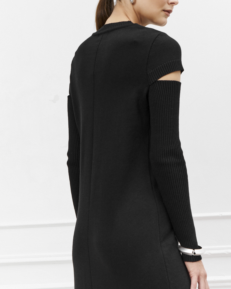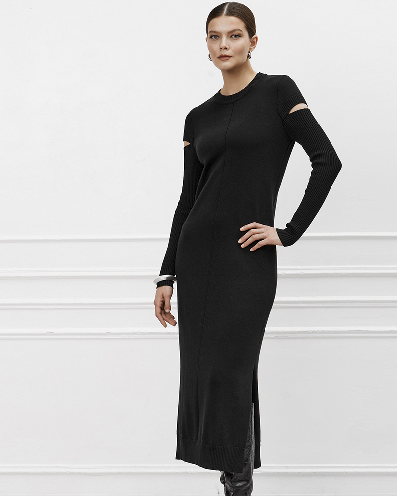 Платье женское, трикотажное, из мягкой пряжи с хлопком. Платье полуприлегающего силуэта, длины миди. Рукава длинные, с вырезами на плече.