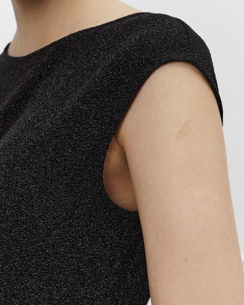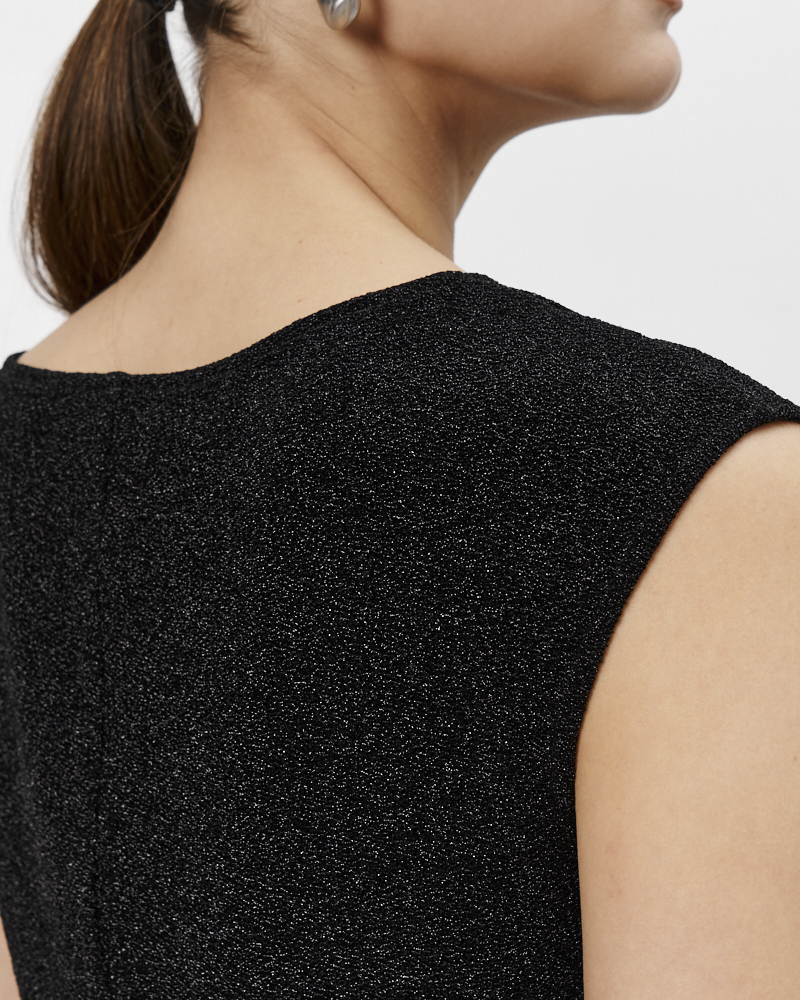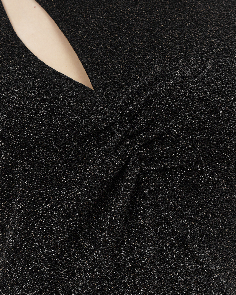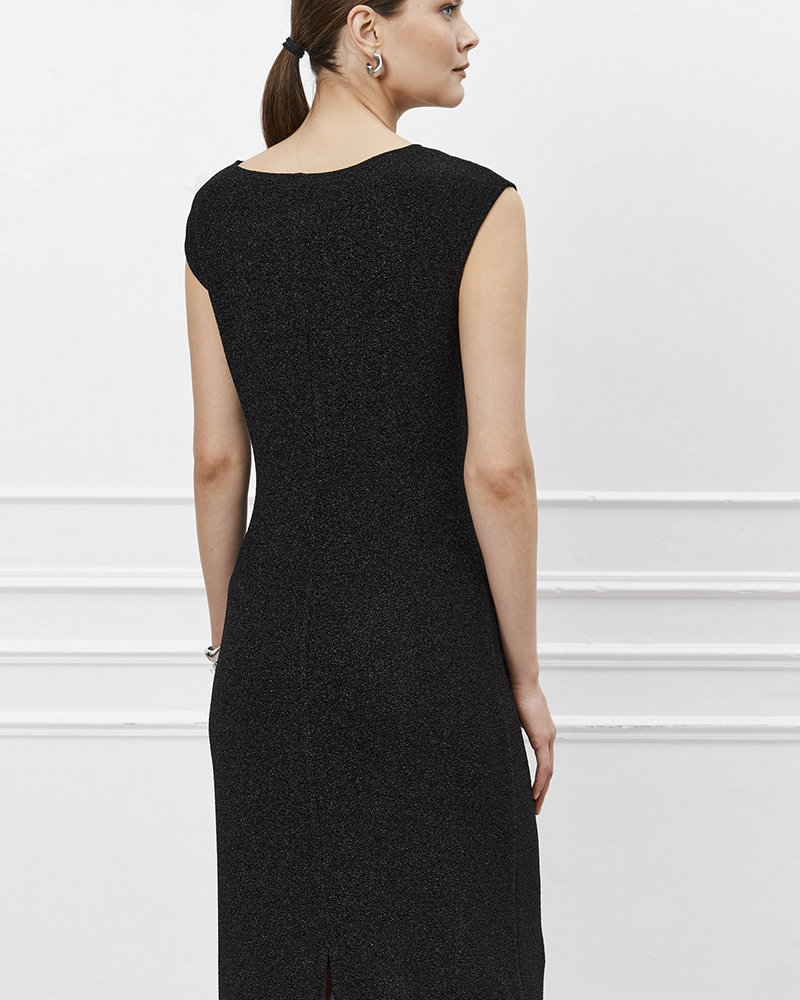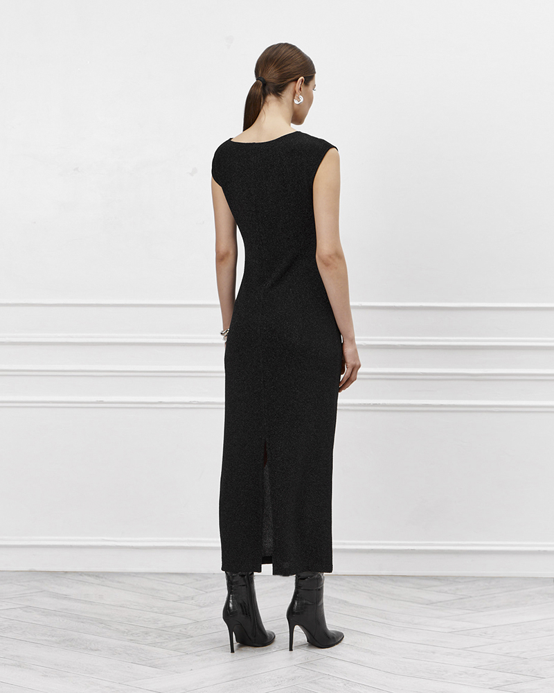 Платье женское вечернее из трикотажного полотна с мерцающим блеском. Декоративный разрез и сборка на передней детали, разрез в среднем шве сзади.