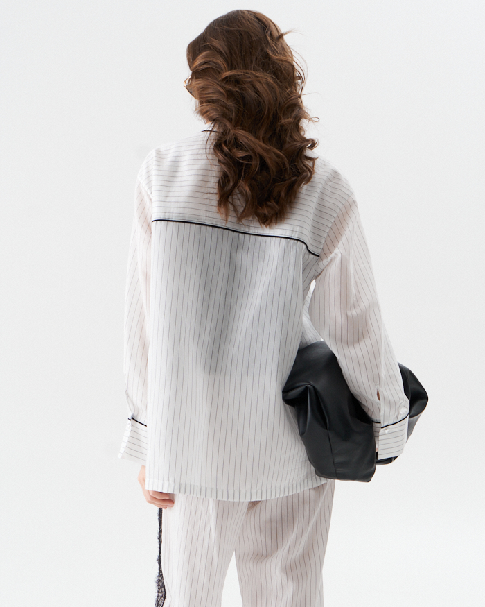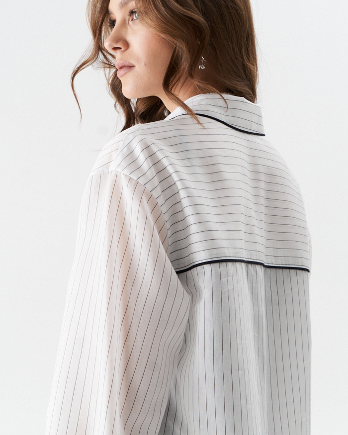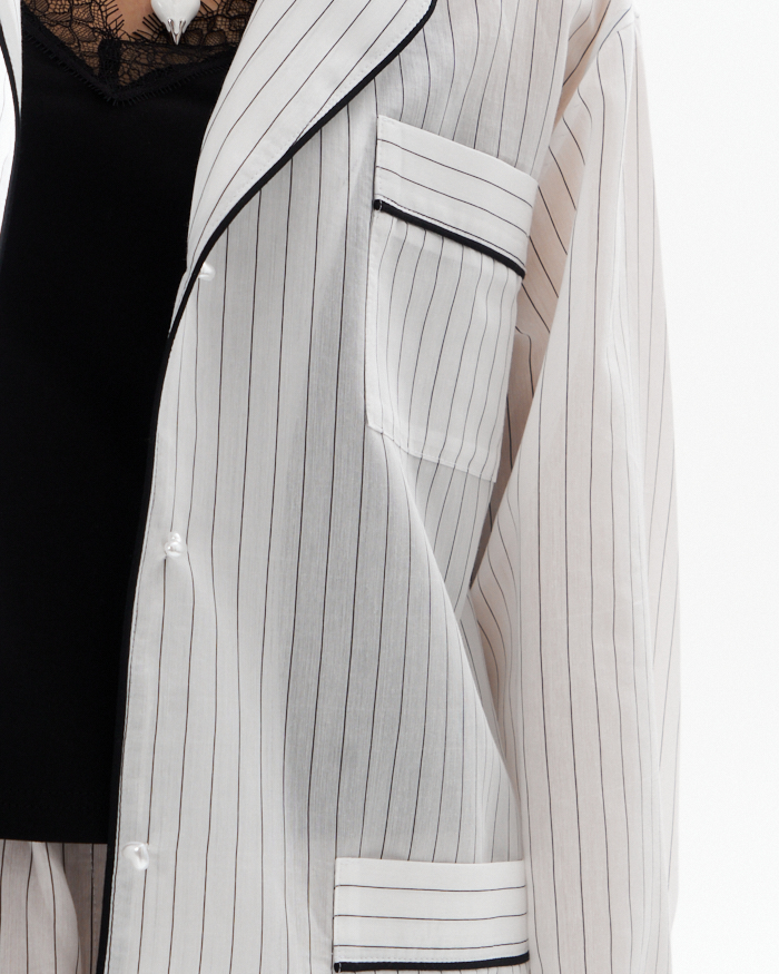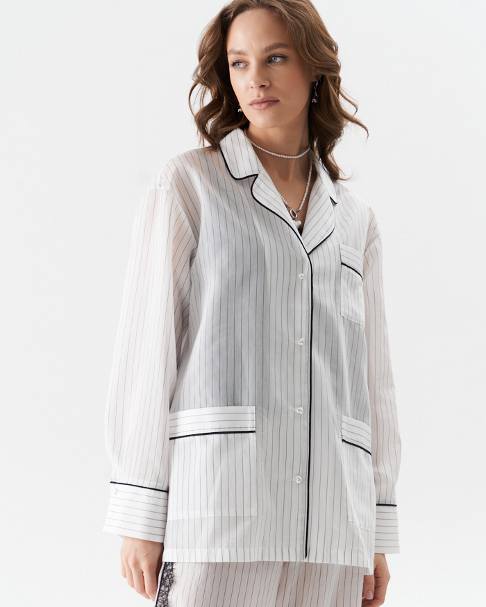 Рубашка в пижамном стиле умереного овер силуэта.По переду расположены два накладных нижних кармана и один верхний .Спинка цельная с отрезной двойной кокеткой .Воротник пиджачного вида .Рукав рубашечный прямой к низу на притачной манжете на одну петлю и пуговицу.Рубашка стилизована втачными кантами контрасного цвета в швах а выразительность изделию придает ткань в полоску ,которая меняет свое направление в деталях.Изделие на 4 петли и 4 пуговицы ввиде милых сердечек.Рубашку можно комбинировать с брюками из этой же ткани М 14122