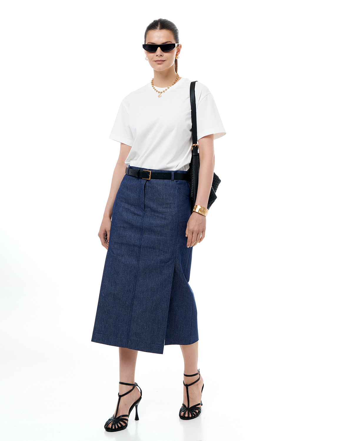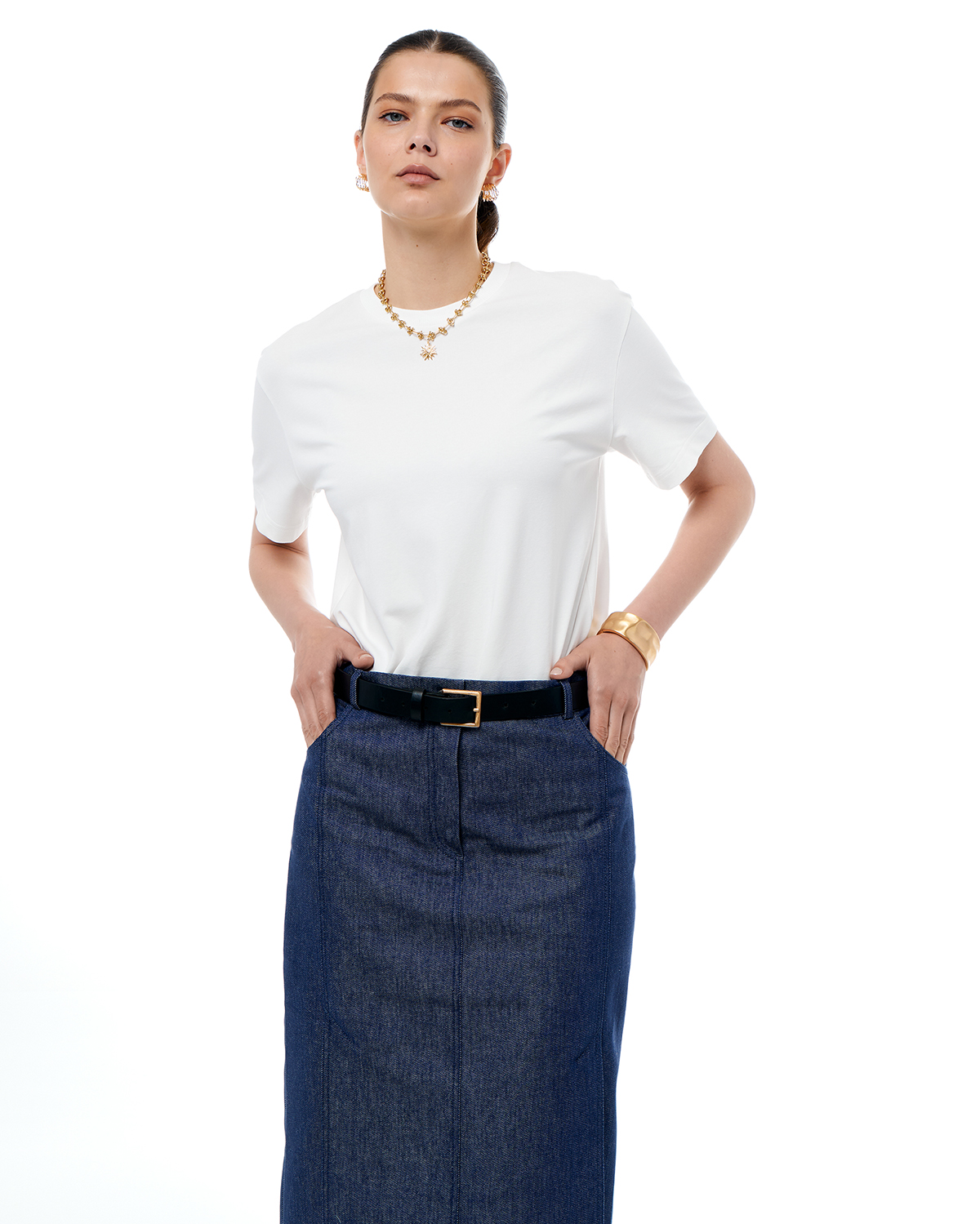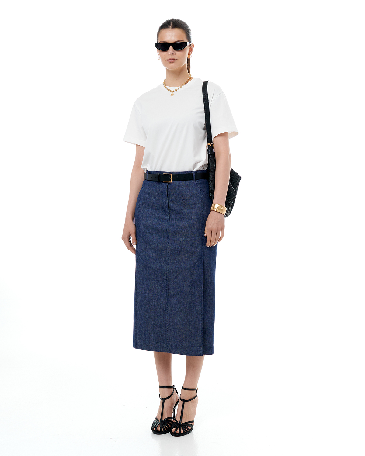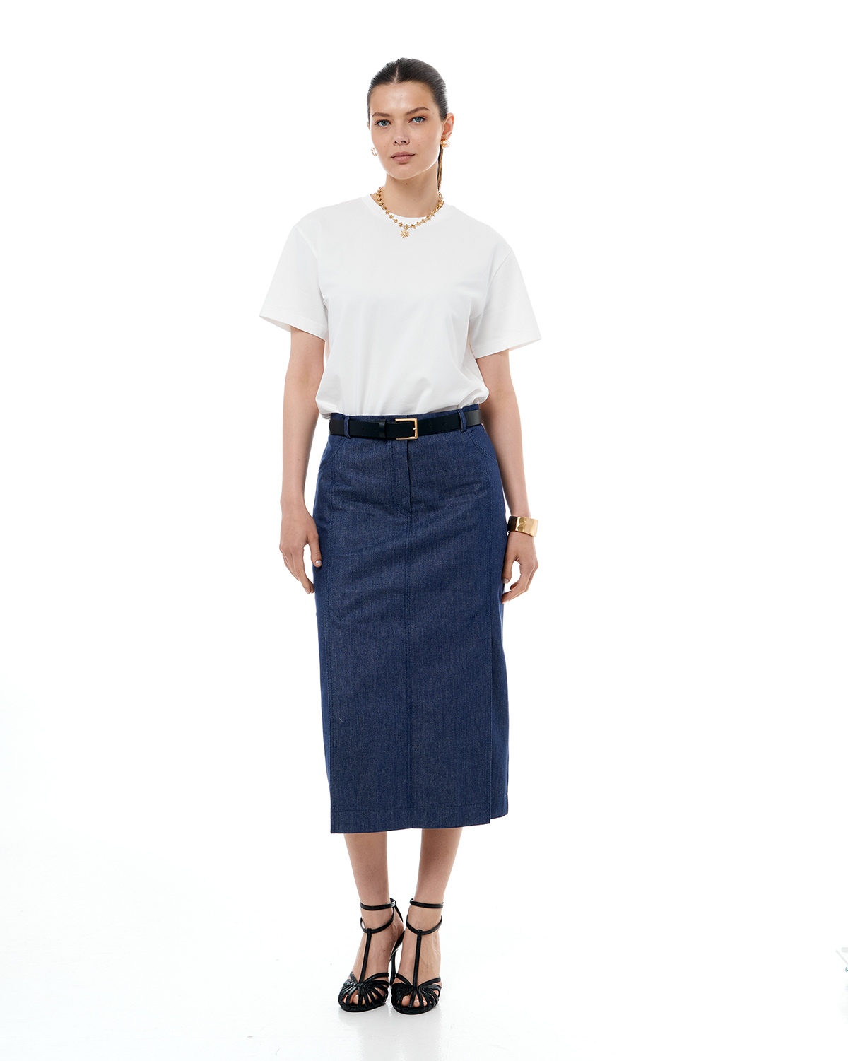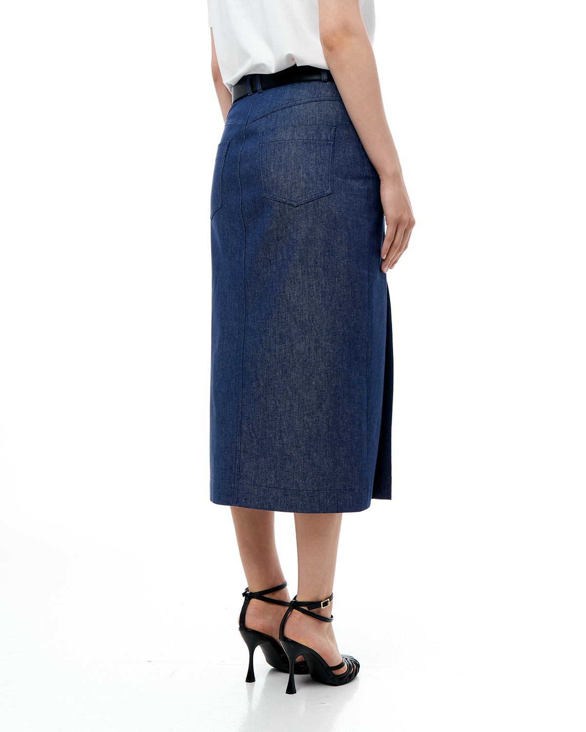 Юбка женская из хлопкового денима, прилегающего силуэта, длины миди. Две шлицы спереди.