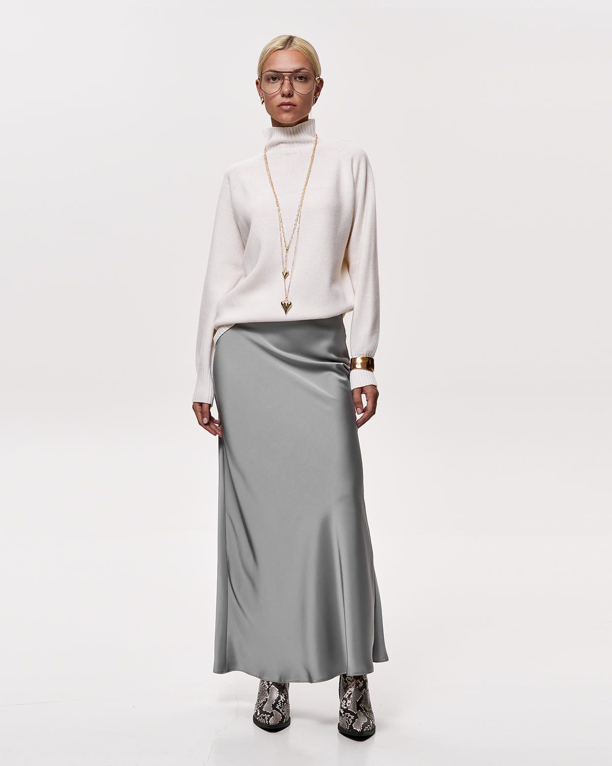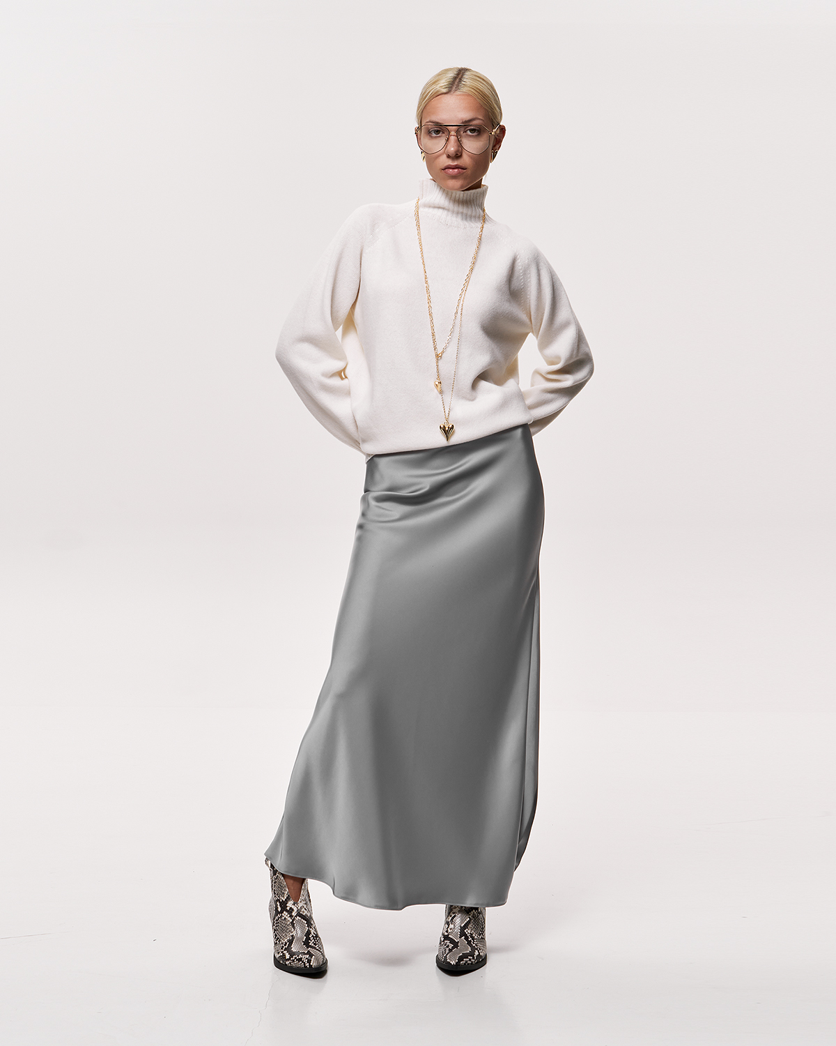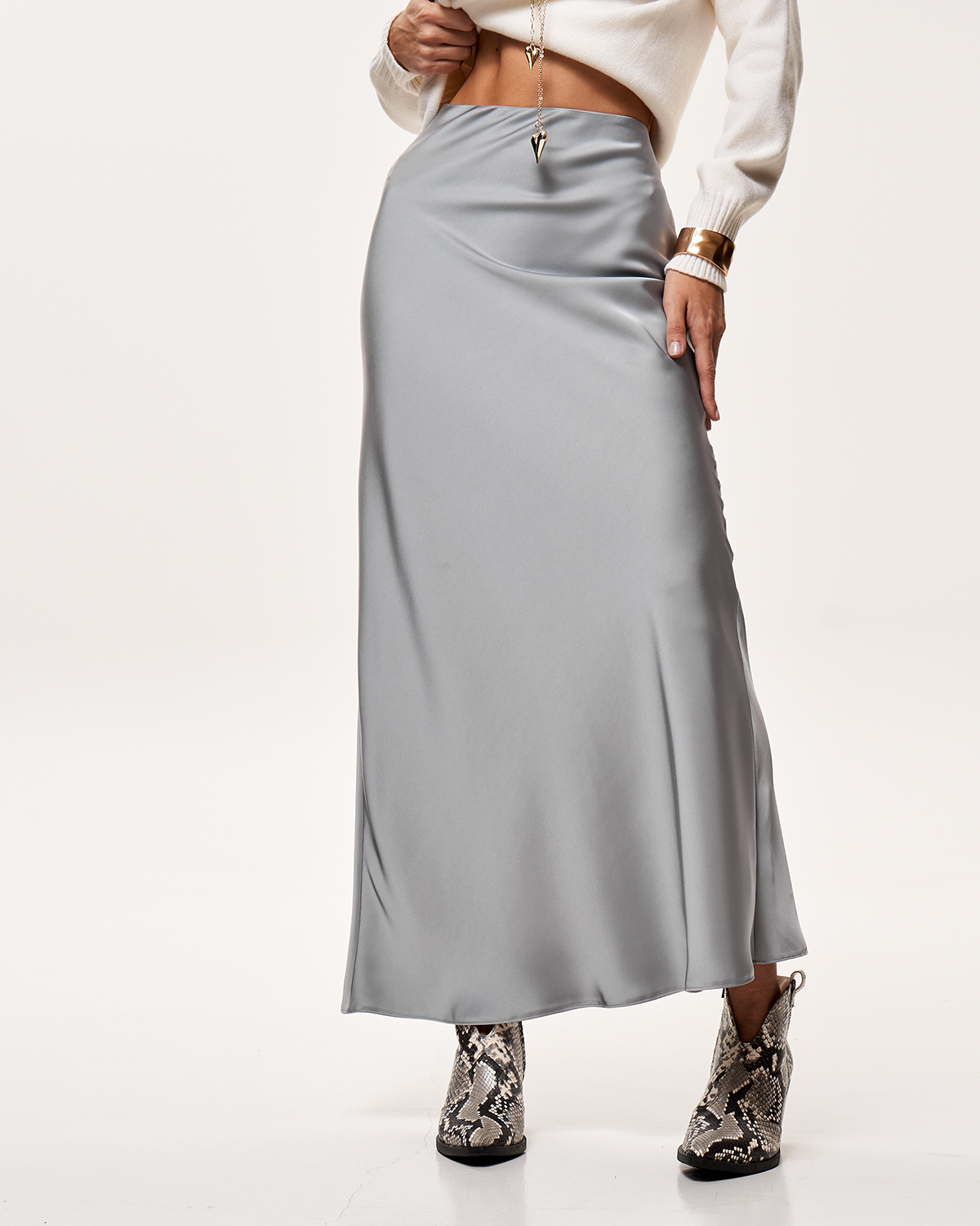 Юбка женская из атласа, полуприлегающего силуэта, длины макси. Скроена "по косой". Застежка на потайную молнию сзади.