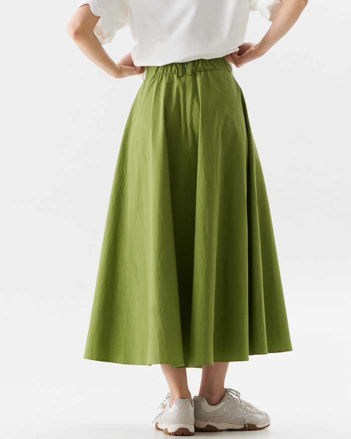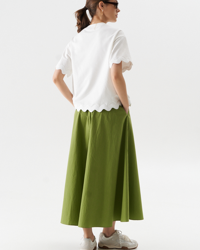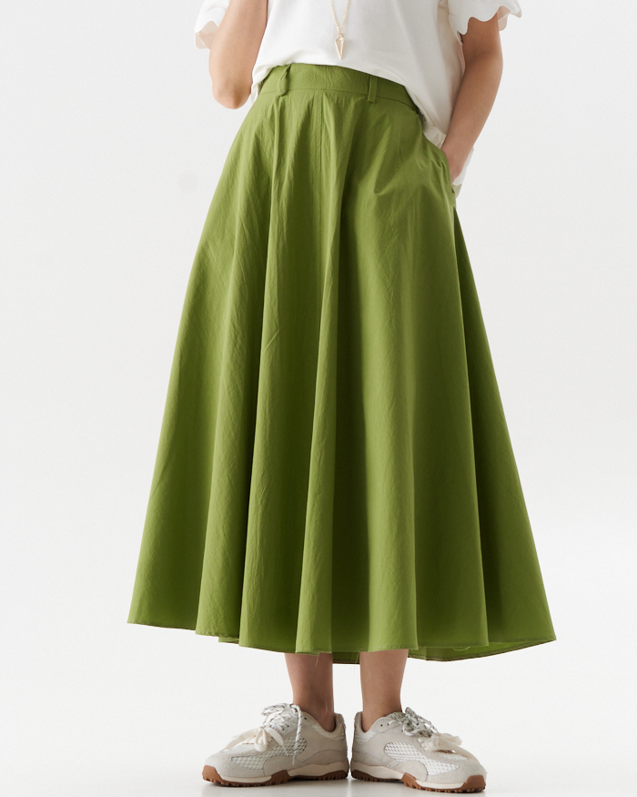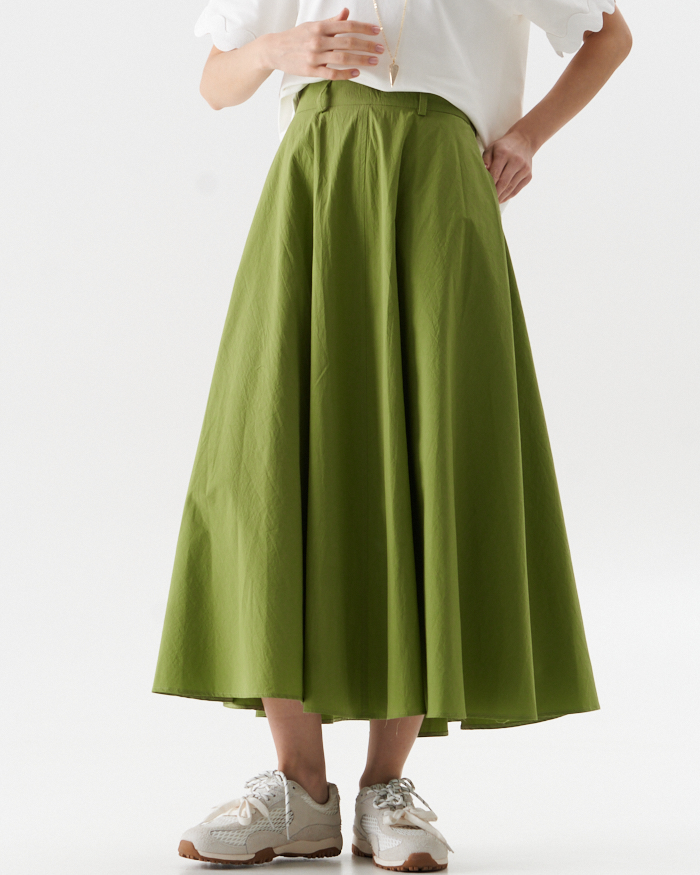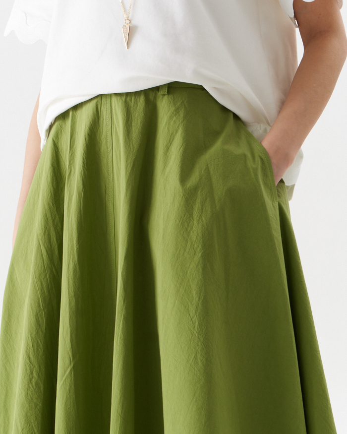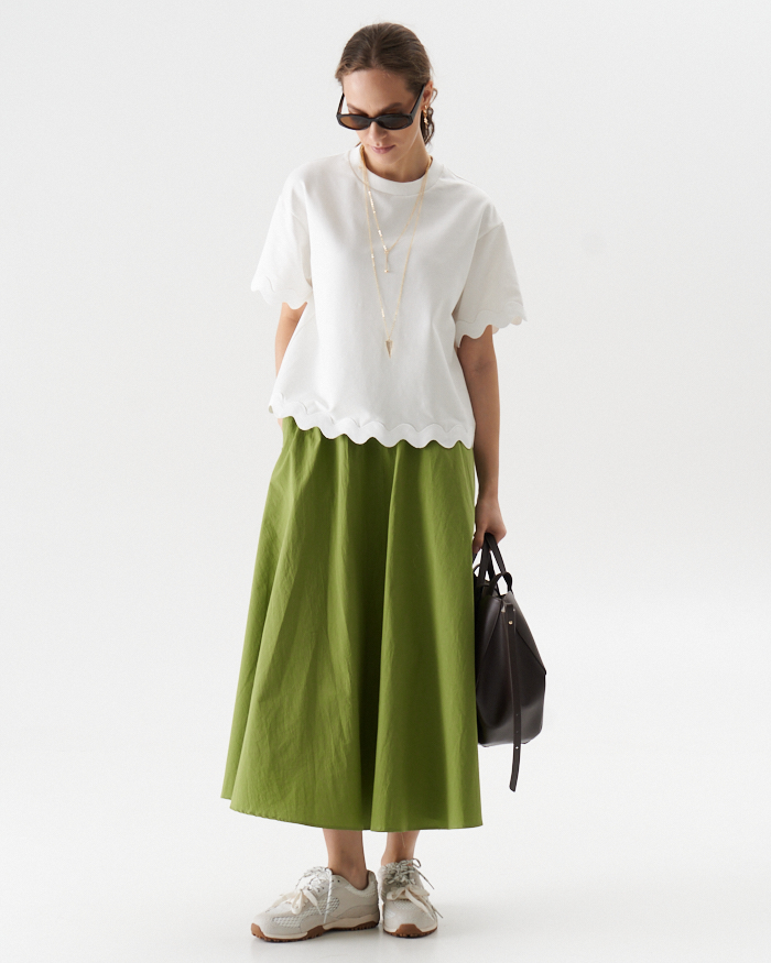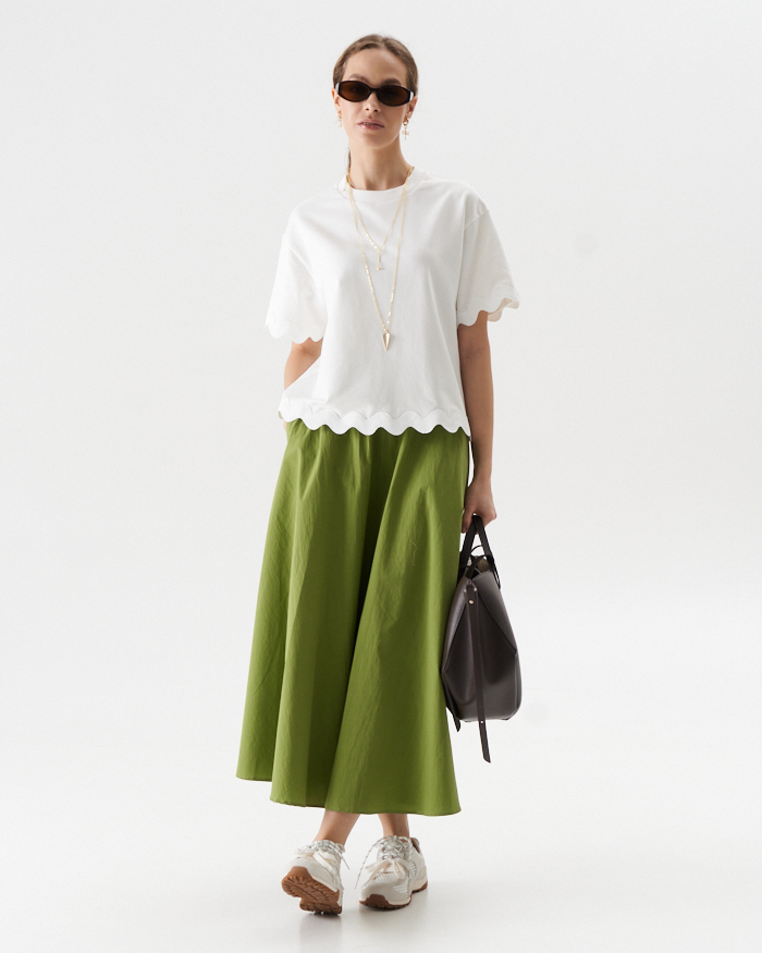 Раскошная юбка полуцолнце их хлопковой ткани в длине миди.Вертикальные центральные швы переднего и заднего полотнища визуально вытягивают силуэт..В боковых швах- карманы .Юбка на отрезном поясе ,по спинке полностью на резинке,что очень удобно при носке.Изделие застегивается на потайную молниюв среднем шве спинки.Длина юбки от пояса 85,0 см в расмерах 42-50 и 88,0 см в размерах 52-58