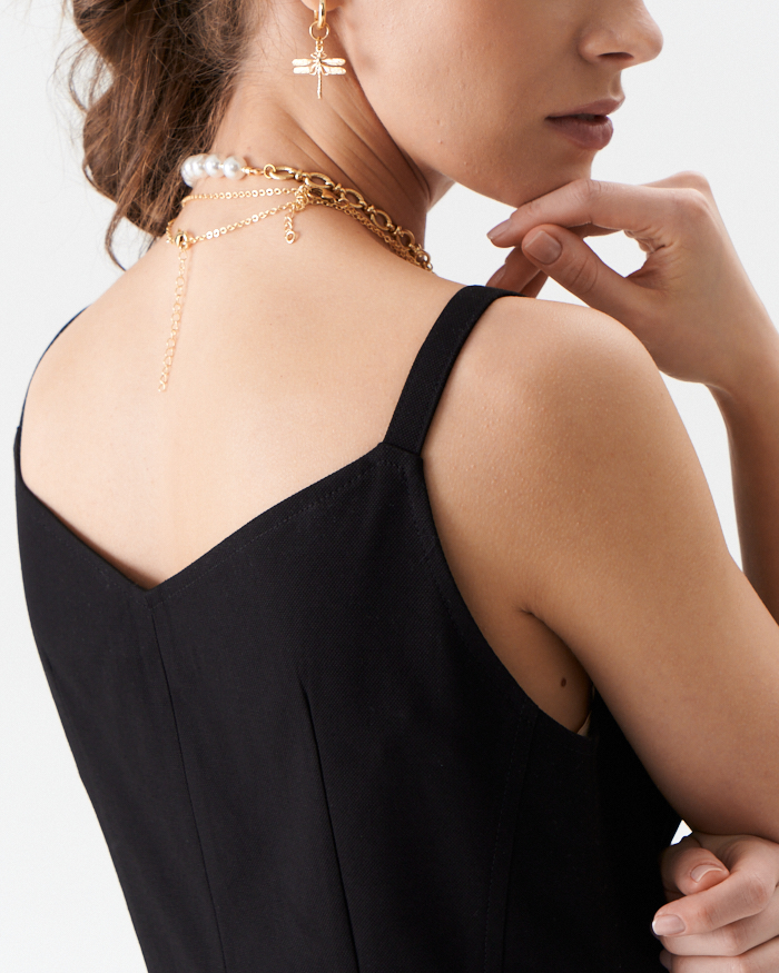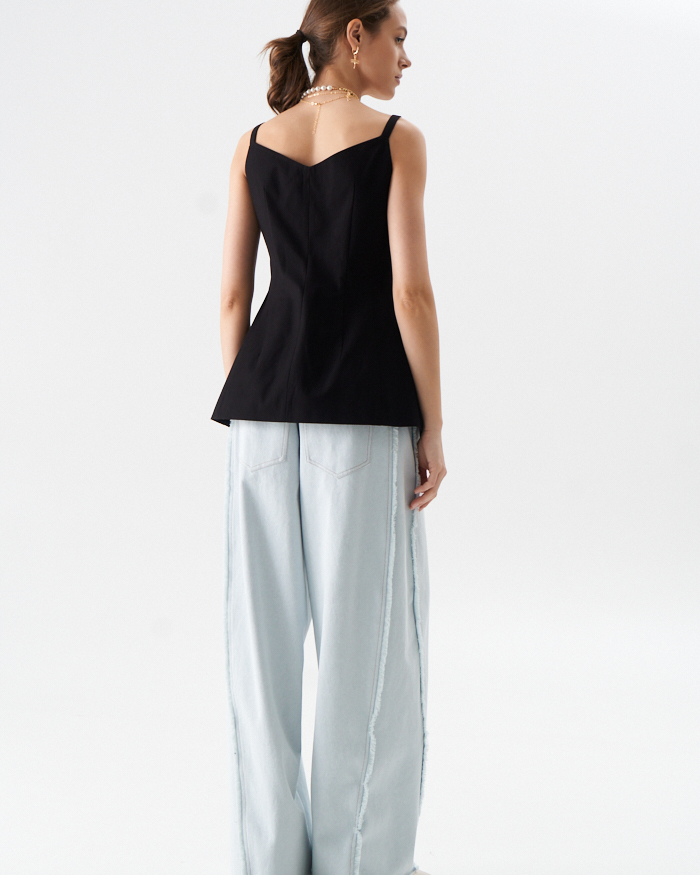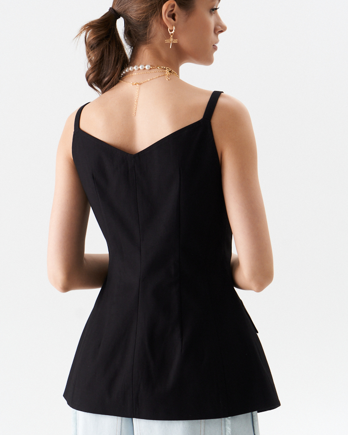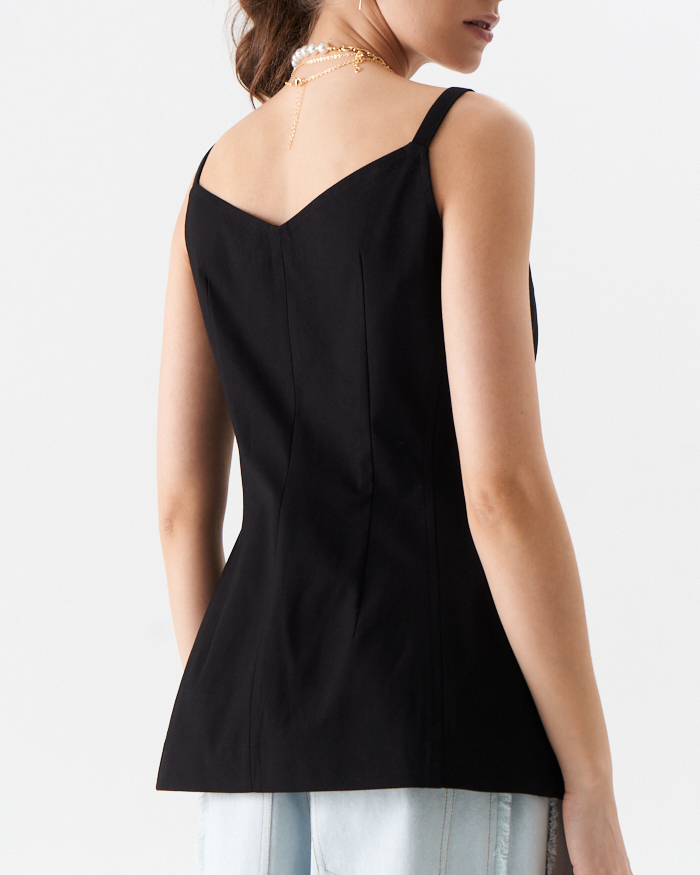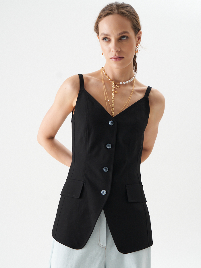 Жилет женский из хлопковой ткани с 3% эластана полуприлегающего силуэта.Рельефные линии переда и спинки,формируют женственный силуэт с изящной талией.У-образный вырез горловины , узкие бретелии и скругленные наклонные углы низа борта визуально вытягивают пропорции фигуры.На переде расположены клапаны ,имитирующие прорезной карман.Изделие закрывает линию бедра .